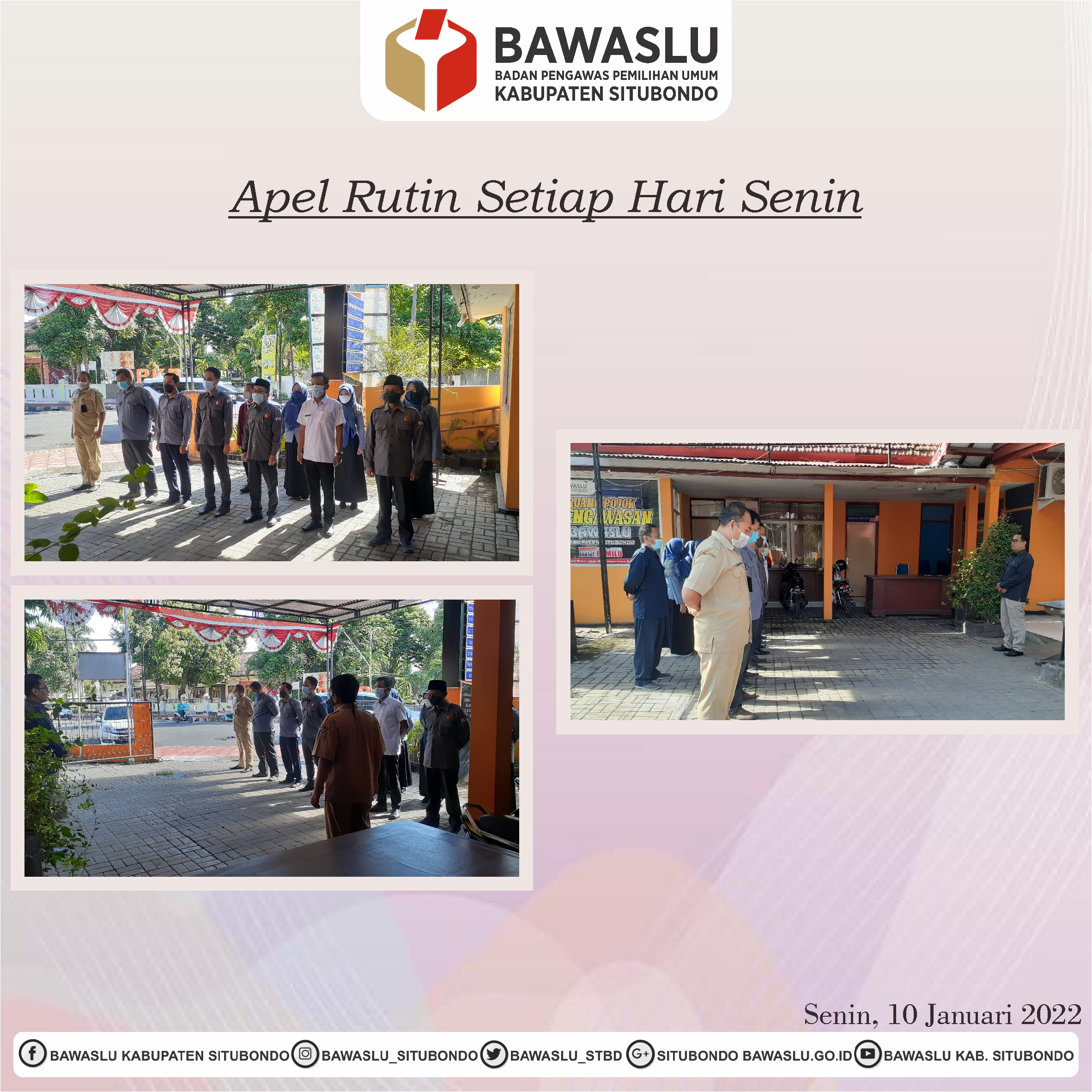 Apel rutin setiap senin pagi di halaman Kantor Bawaslu Kabupaten Situbondo. Apel kali ini di pimpin langsung oleh Ketua Bawaslu Kabupaten Situbondo Murtapik. (10/01/2022)