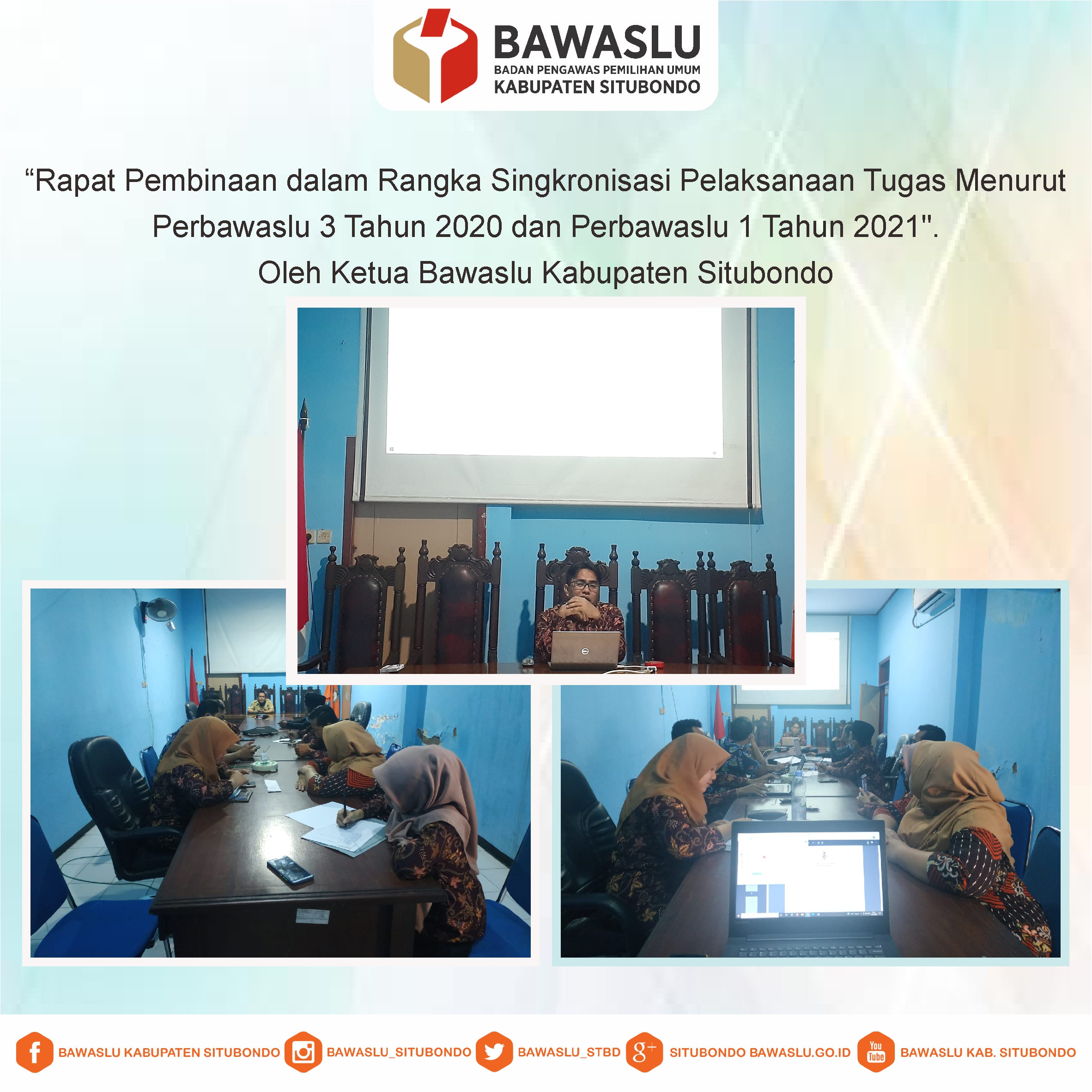 Rapat Pembinaan dalam rangka sinkronisasi pelaksanaan tugas menurut Perbawaslu 3 tahun 2020 dan perbawaslu 1 tahun 2021 oleh Ketua Bawaslu Situbondo ini di ikuti oleh seluruh staf yang ada dilingkungan kerja Bawaslu Situbondo meliputi staf teknis, baik staf PNS maupun Non PNS serta staf pendukung.