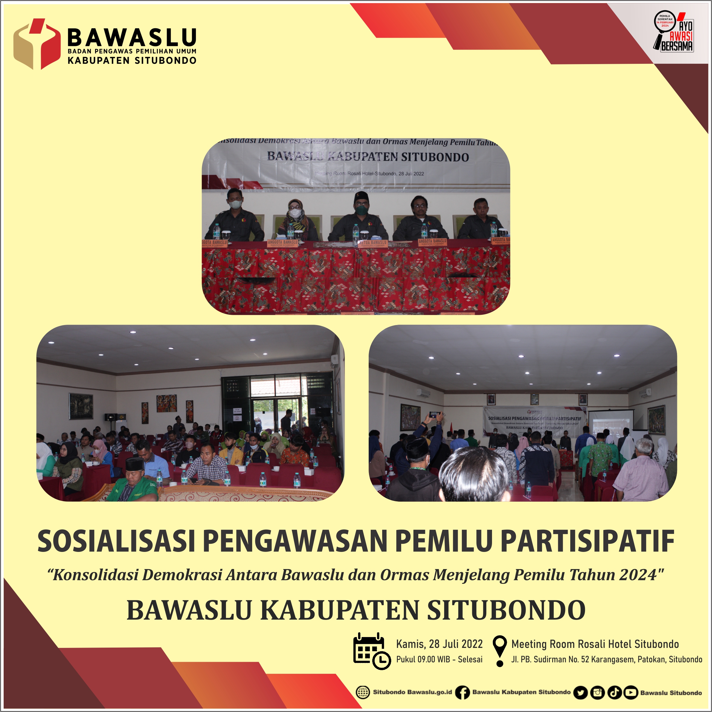 Badan Pengawas Pemilihan Umum Kabupaten Situbondo menggelar kegiatan Sosialisasi Pengawasan Pemilu Partisipatif dengan tema Konsolidasi Demokrasi Antara Bawaslu dan Ormas Menjelang Pemilu Tahun 2024 di Meeting Room Rosali Hotel Situbondo. Kamis, 28/07/2022.