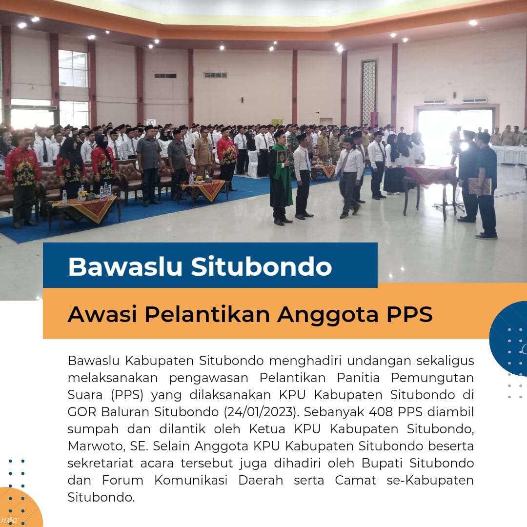 Bawaslu Kabupaten Situbondo menghadiri undangan sekaligus melaksanakan pengawasan Pelantikan Panitia Pemungutan Suara (PPS) untuk Pemilu Serentak Pemilu Tahun 2024 (24/01/2023) di GOR Baluran Situbondo. Berdasarkan dengan ketentuan pada pengumumuman KPU Kabupaten Situbondo nomor 59/PP.04.1-Pu/3512/2023 tentang Penetepan Hasil Seleksi Calon Anggota Panitia Pemungutan Suara (PPS) untuk Pemilu Serentak Tahun 2024 bahwa sebanyak 408 Orang yang dinyatakan sebagai PPS terpilih.