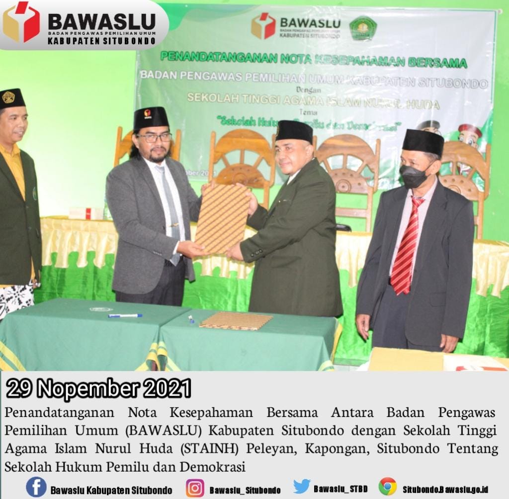 Situbondo.bawaslu.go.id- Bawaslu Kabupaten Situbondo melakukan kegiatan Penandatanganan Nota Kesepahaman antara Badan Pengawas Pemilihan Umum (BAWASLU) Kabupaten Situbondo dengan Sekolah Tinggi Agama Islam Nurul Huda (STAINH) Peleyan, Kapongan, Situbondo yang dilakukan di Kampus STAINH pada hari Senin (29/11/2021).