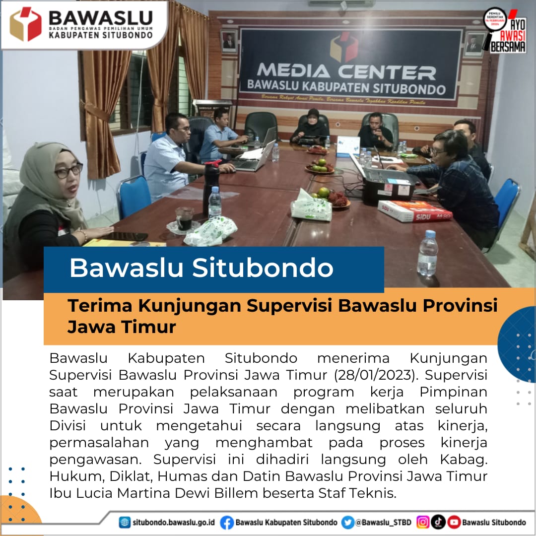 Bawaslu Kabupaten Situbondo menerima kunjungan supervisi Bawaslu Provinsi Jawa Timur (28/01/2023) ke Kantor Bawaslu Kabupaten Situbondo. Supervisi ini diterima langsung oleh Ketua dan Anggota diruang Media Center beserta seluruh Staf di Sekretariat Bawaslu Kabupaten Situbondo.