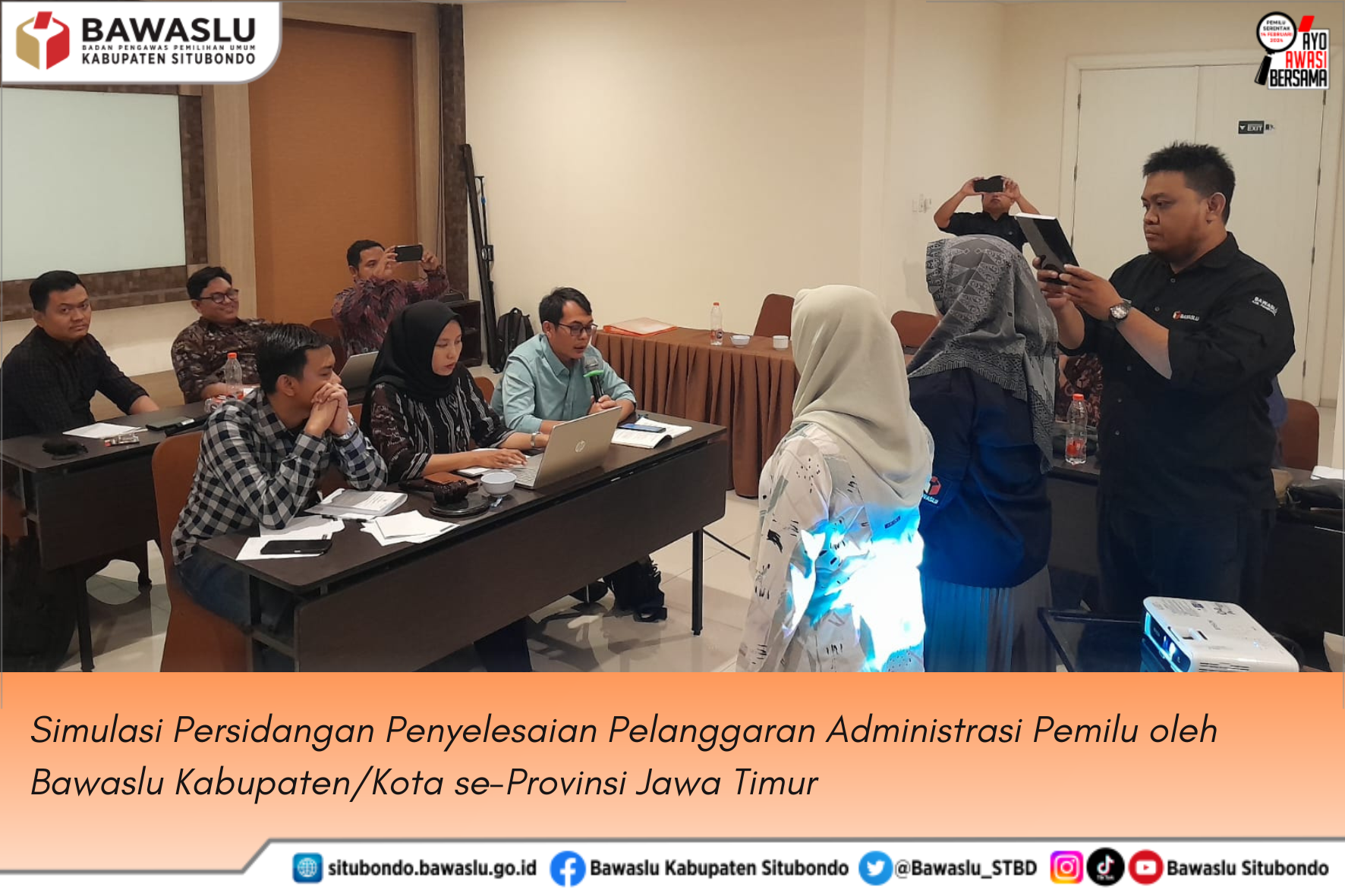 Bawaslu Kabupaten Situbondo. Divisi Penanganan Pelanggaran Bawaslu Provinsi Jawa Timur melaksanakan Simulasi Sidang Penyelesaian Pelanggaran Administrasi Pemilu bertempat di Kantor Bawaslu Kota Malang. Acara dilaksanakan selama dua hari yakni 11 s.d 12 Oktober 2023.