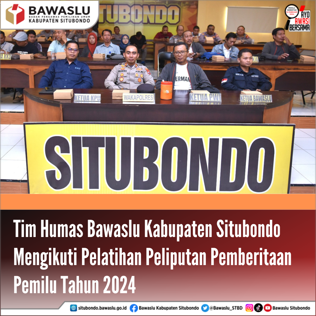 Bawaslu Kabupaten Situbondo. Polda Jawa Timur melaksanakan pelatihan peliputan Pemilu 2024, dengan tema Sinergitas Polda Jawa Timur bersama awak media dalam rangka mensukseskan Pemilu Tahun 2024 (10/10/2023).