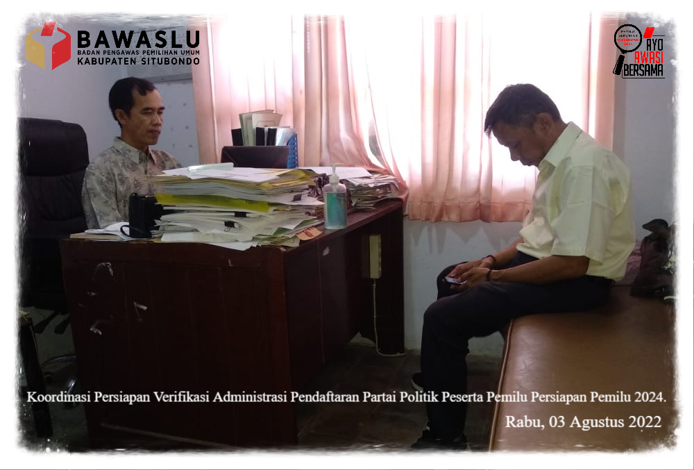 Rabu, 03 Agustus 2022 Koordinator Divisi Penyelesaian Sengketa Bersama satu orang staf Bawaslu Kabupaten Situbopndo melaksanakan koordinasi dalam rangka Persiapan Verifikasi Administrasi Pendaftaran Partai Politik Calon Peserta Pemilu Tahun 2024 ke Kantor KPU Kabupaten Situbondo.