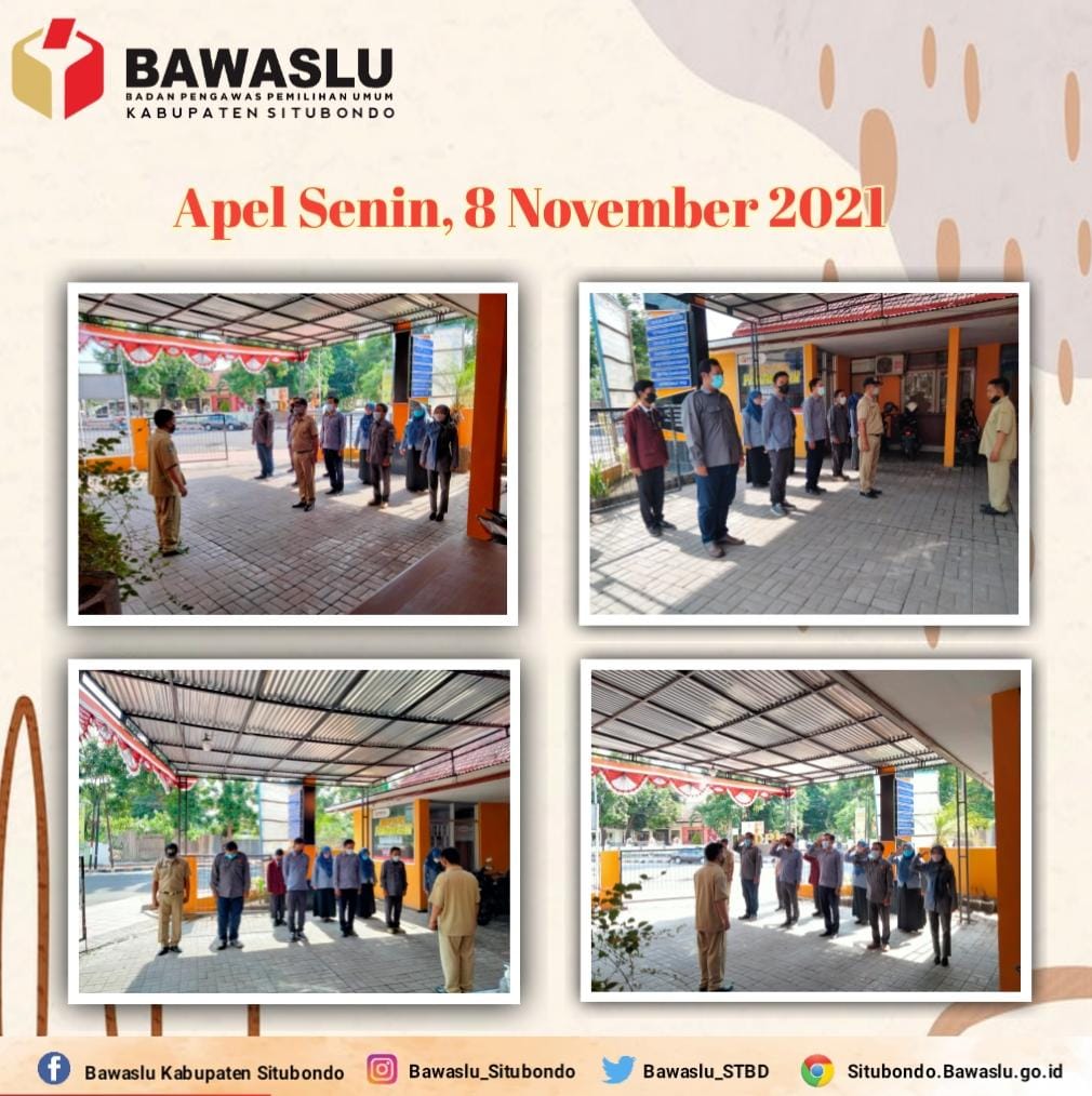 Situbondo.bawaslu.go.id- Kegiatan apel pada Senin pagi Bawaslu Kabupaten Situbondo merupakan aktivitas rutinan yang wajib dilaksanakan untuk menyambut hari baru lainnya. Sebagai bentuk kedisiplinan para pegawai dan staf dilingkungan Badan Pengawas Pemilu Kabupaten Situbondo. Apel ini dilaksanakan di halaman Kantor Bawaslu Kabupaten Situbondo, Senin (08/11/21).