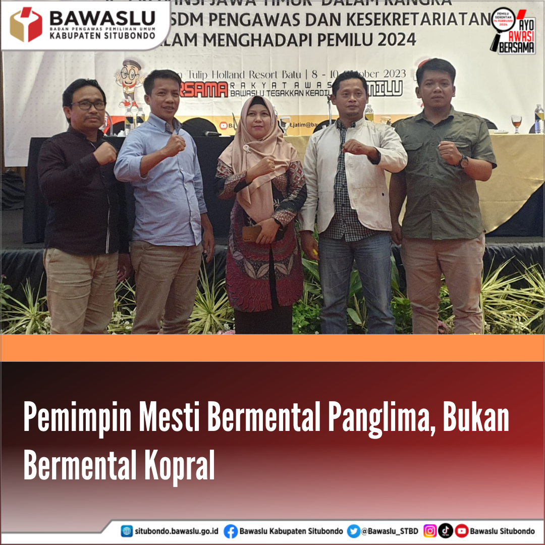 Lebih lanjut, Ketua Bawaslu Provinsi Jatim ini menegaskan bahwa pemimpin mesti bermental panglima, bukan bermental kopral. Kepemimpinan mesti bergaya jenderal, bukan bergaya seorang prajurit. Kehadiran dan eksistensinya dirasakan dapat memberikan solusi, bukan menjadi persoalan dan beban bagi yang dipimpinnya.