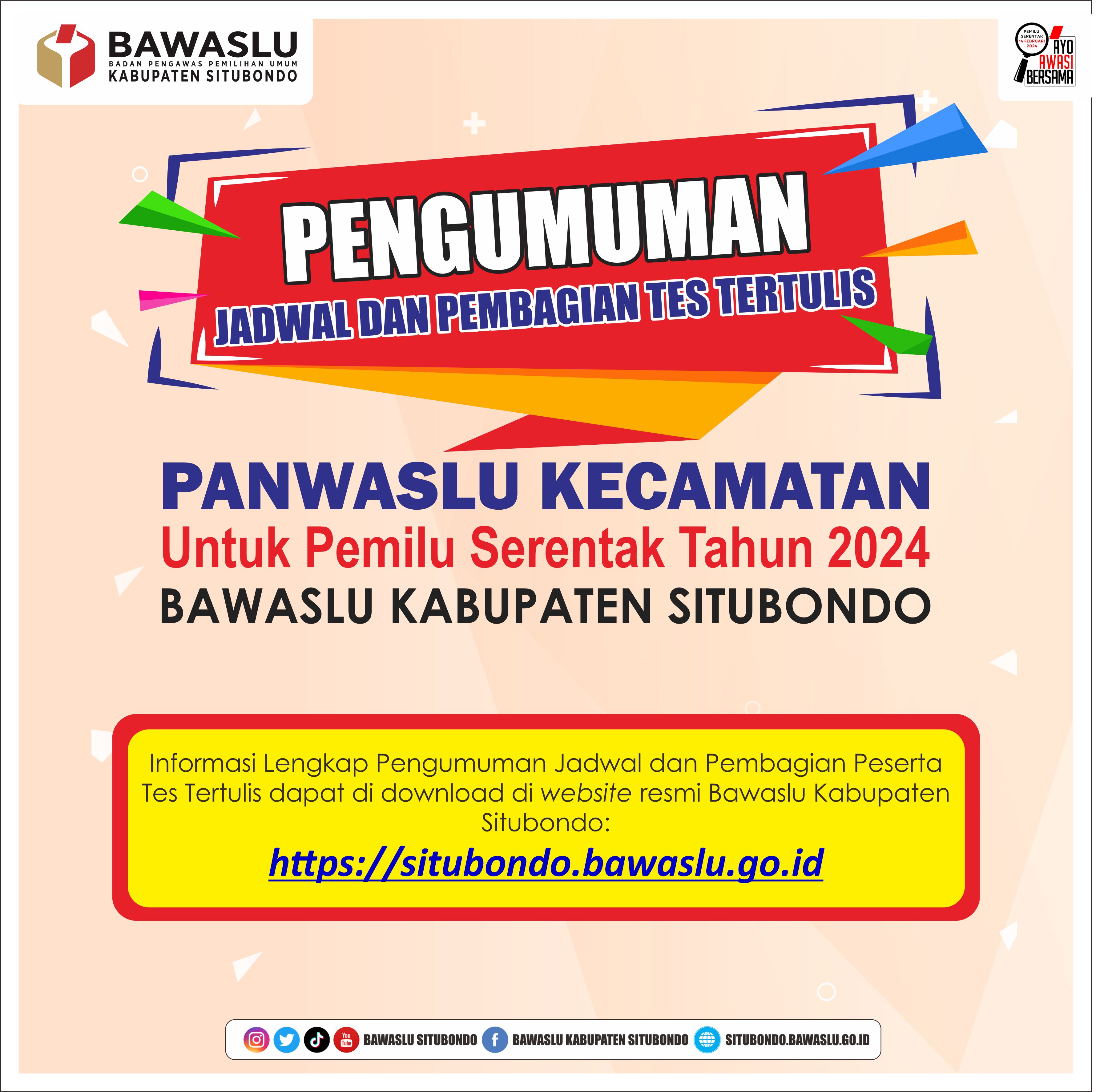PENGUMUMAN JADWAL DAN PEMBAGIAN TES TERTULIS CALON ANGGOTA PANWASLU KECAMATAN SE-KABUPATEN SITUBONDO