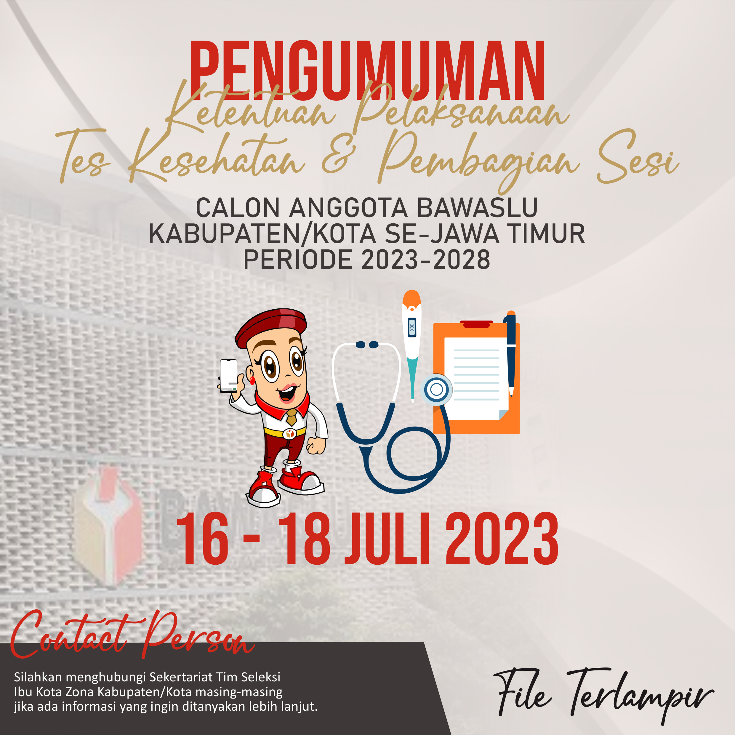 PENGUMUMAN KETENTUAN PELAKSANAAN TES KESEHATAN DAN PEMBAGIAN SESI CALON ANGGOTA BAWASLU KABUPATEN/KOTA MASA JABATAN 2023–2028