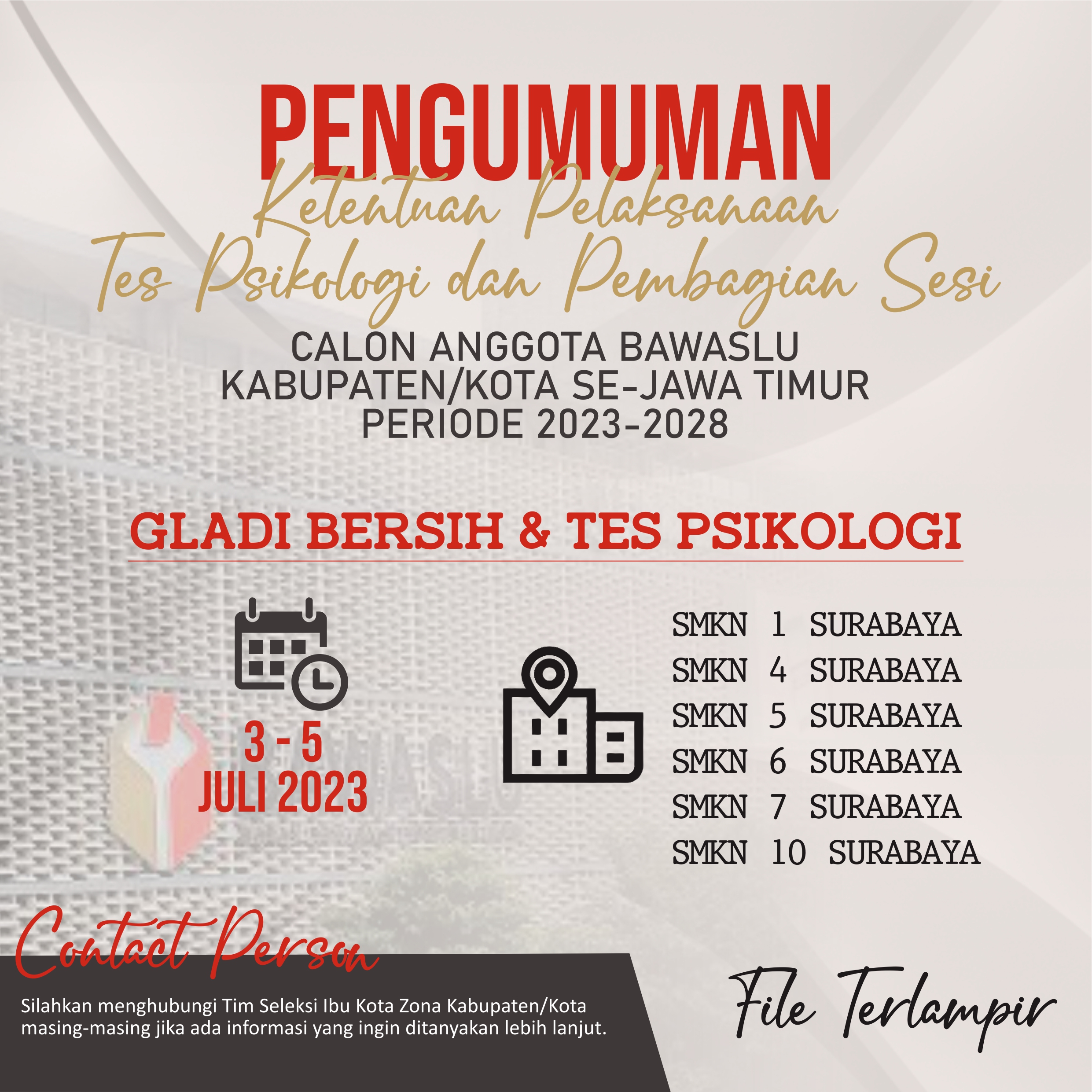 PENGUMUMAN KETENTUAN PELAKSANAAN TES PSIKOLOGI DAN PEMBAGIAN SESI CALON ANGGOTA BAWASLU KABUPATEN/KOTA PROVINSI JAWA TIMUR ZONA 3 MASA JABATAN 2023 – 2028