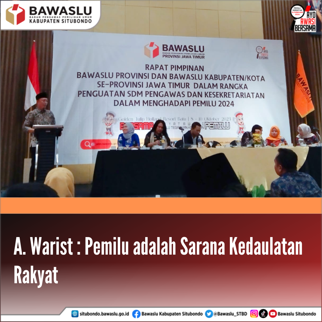 Ketua Bawaslu Provinsi Jawa Timur A. Warits dalam sambutan menyampaikan bahwa, Pemilu merupakan susunan negara Republik Indonesia yang berkedaulatan rakyat. Maka penting dalam membentuk cara berfikir kita terhadap Pemilu menempatkan Pemilu sebagai Sarana Kedaulatan Rakyat.