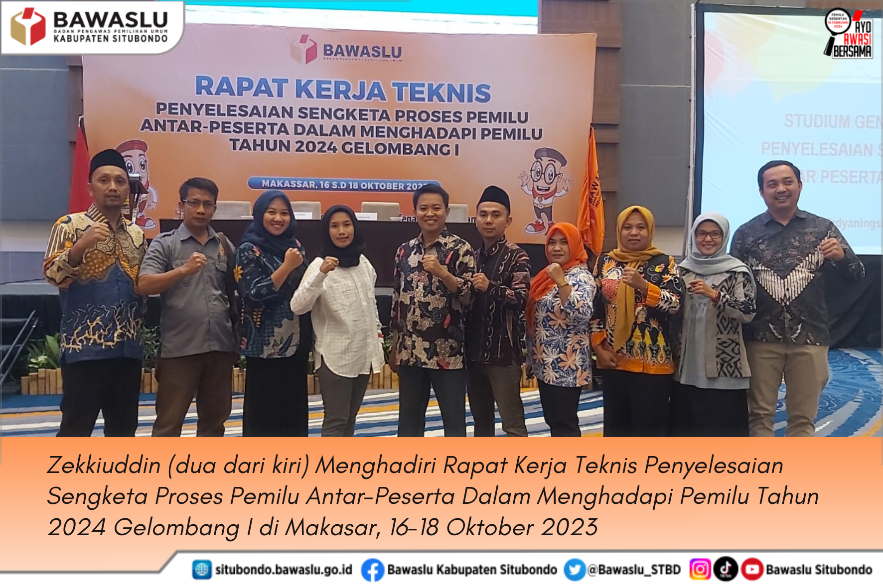 Bawaslu Kabupaten Situbondo. Dalam rangka peningkatan kompetensi pengawas pemilu, Bawaslu Situbondo hadiri RAKERNIS Penyelasaian Sengketa Antar peserta pemilu yang diadakan Bawaslu di makassar. Dalam kesempatan ini bawaslu situbondo diwakili oleh Zekiuddin selaku Koordinator Divisi Hukum dan Penyelesaian Sengkeya bersama staf teknisnya Sullam.